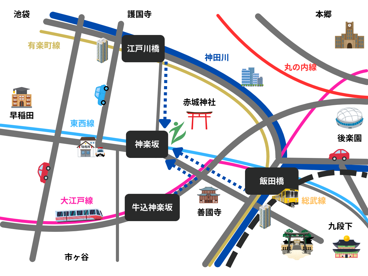 東京メトロ東西線の神楽坂駅1b出口から徒歩30秒 神楽坂駅から最も近いクリニックです 神楽坂駅だけではなく、牛込神楽坂駅、 飯田橋駅、江戸川橋駅からもアクセスしやすいです