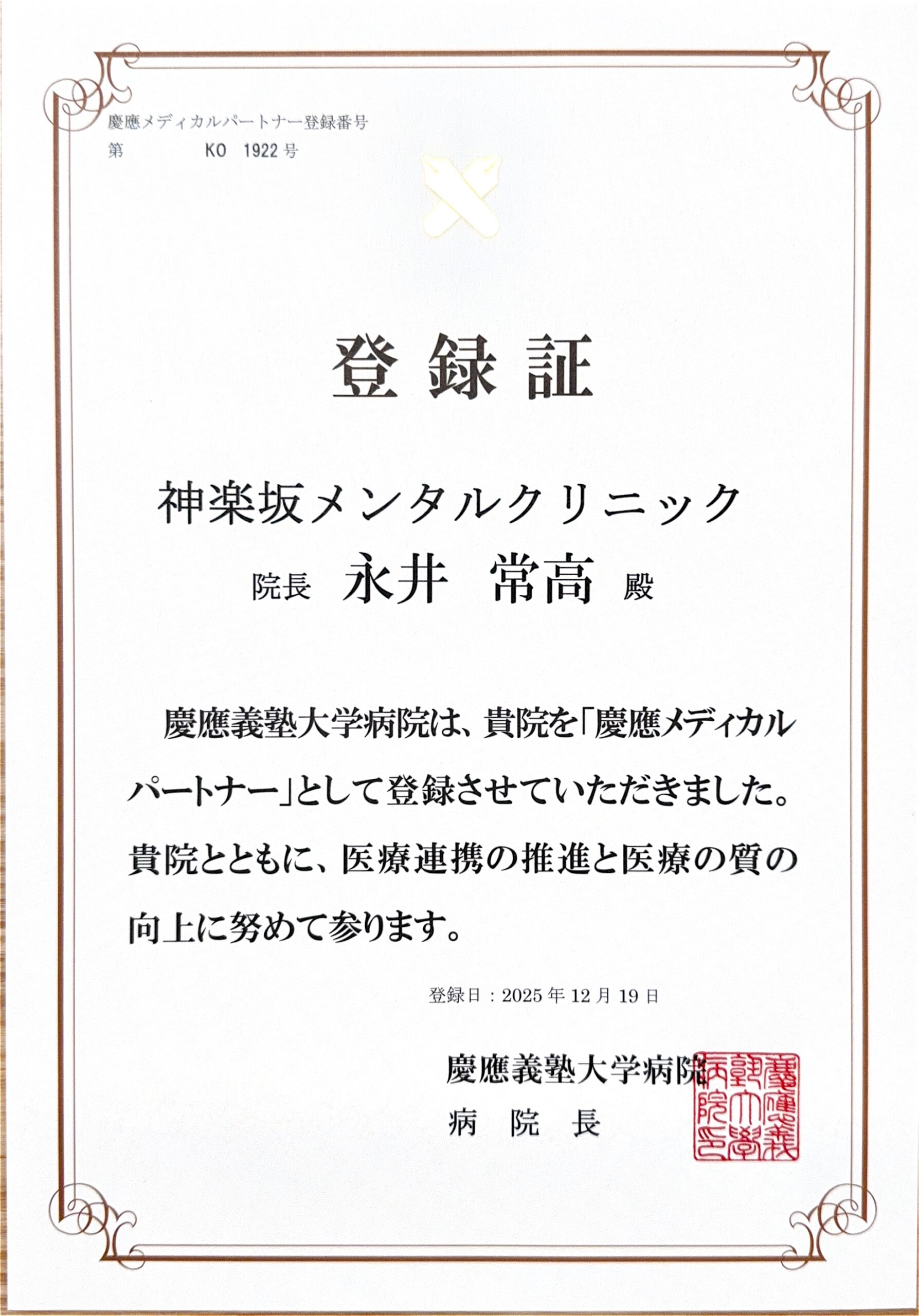 神楽坂メンタルクリニックは、このたび 慶應メディカルパートナーシップ を締結しました。